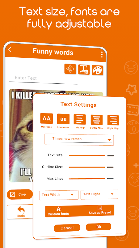Накройте изображение текстом. Приложение Meme Maker - Meme Creator позволяет легко применять различные текстовые эффекты, такие как типографика, цвет и т. д., и переносить этот текст в любое место в области изображения.