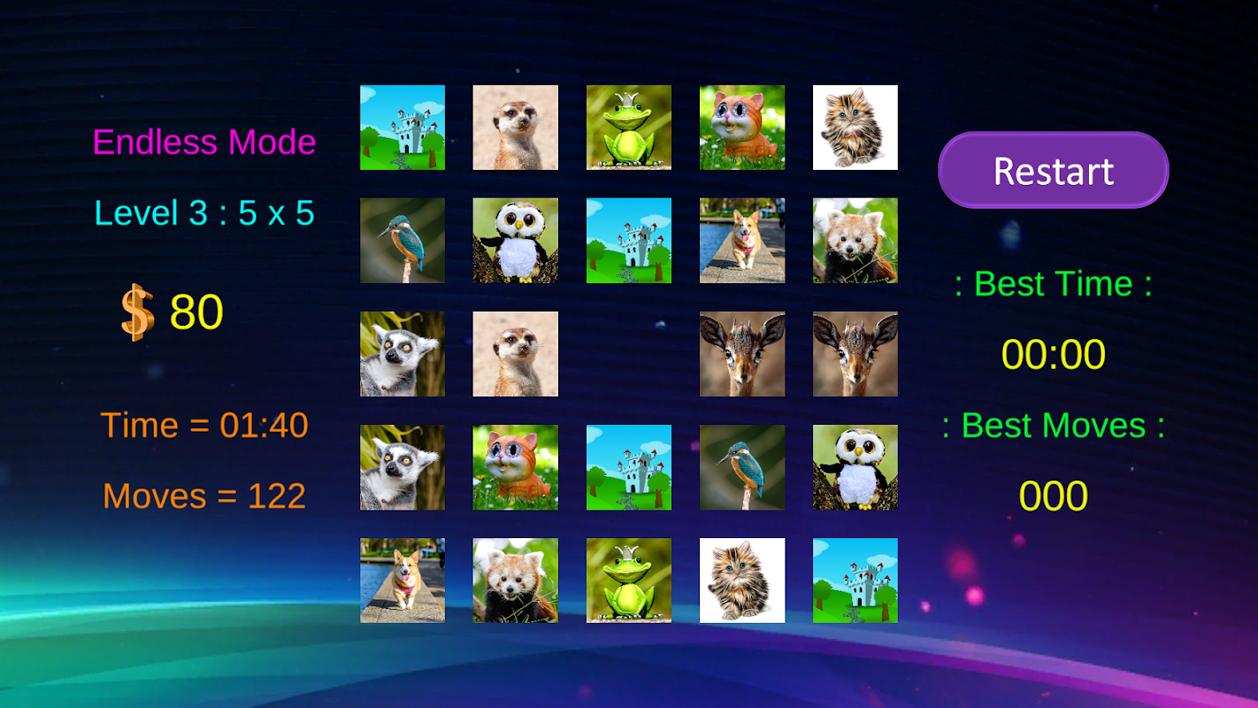 5. Endless Mode: No time or moves limit. Beat your friend's score or your previous score.