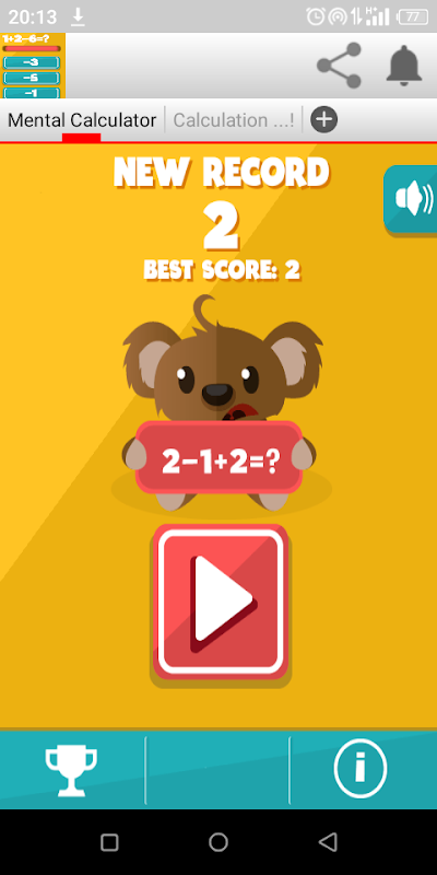 2- раздел под названием «Расчет»: содержит дополнение; вычитание; умножение и смешение... по моему выбору... я выбираю нужную операцию, и птицы начинают приближаться, плетясь за операцией; Я должен искать результат; напишите его и нажмите на кнопку "Атака" чтобы убить ближайшую птичку....если операция и просто птичка исчезнет если операция неправильная птичка приблизится и вы проиграете....операции должны решить быстро, чтобы выиграть .... чисто образовательное приложение и позволяет пользователю освоить математические операции во время игры .... отлично ...!