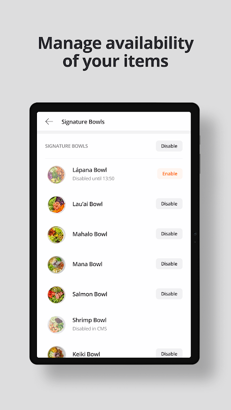 Планшетное приложение MENU позволяет персоналу ресторана отслеживать список активных и предстоящих заказов, уведомлять клиентов, когда заказ готов к выдаче, задерживать или отменять заказы и возмещать их. Это также позволяет сотрудникам ресторана быстро изменять пункт меню, доступность комбо и модификаторов, а также обновлять среднее время приготовления еды для своего магазина без необходимости использования системы управления контентом. Заказы по всем внутренним (мобильные приложения, киоски и веб-приложения) и внешним (агрегаторы) каналам управляются с помощью одного приложения для планшета.