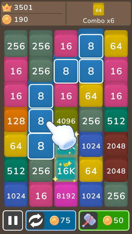 По своей сути Merge and Blast + 2048 — это логическая числовая головоломка. Перемещайте плитки с совпадающими числами, чтобы объединить их в более крупные значения — начните с малого, стремитесь к легендарной плитке 2048 или продвигайтесь дальше до 2248 и выше! Когда доска заполнится, активируйте тактический взрыв, чтобы очистить место и сохранить головоломку. Каждый слайд и взрыв требуют умного планирования, превращая эту казуальную игру в настоящую головоломку.