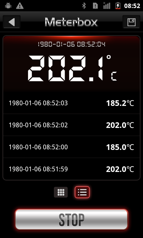 Meterbox iThermo for Android app is the professional industry software, which provides fast, easy and accurate temperature measurement by CEM Professional Infrared Thermometer DT-8889 via Bluetooth, for finding draughts and thermal leaks in buildings/blast-furnace, checking temperatures of engine, coolant, exhaust etc. Meterbox iThermo app enhances user experience about visualization, measuring scene, data logging, data comparing & data sharing.