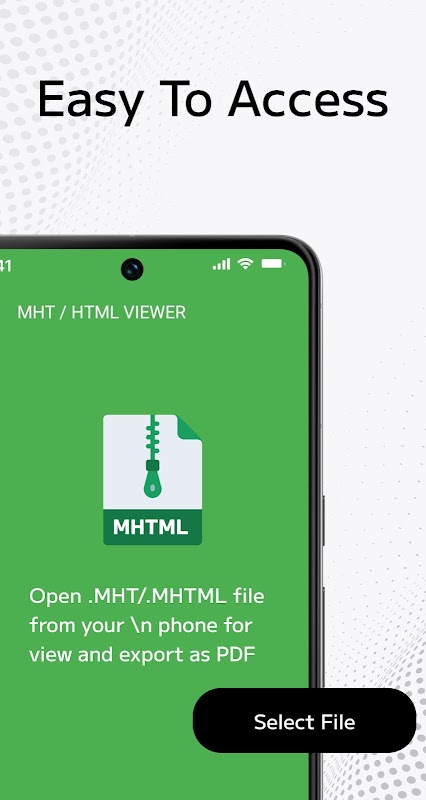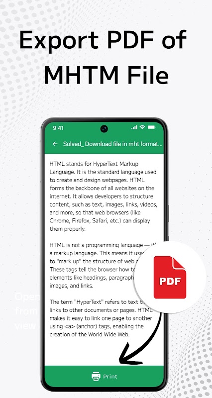 MHT/MHTML Viewer — это простой, но мощный инструмент, позволяющий просматривать файлы MHT и MHTML прямо на вашем устройстве. Всего несколькими нажатиями вы можете открыть, прочитать, распечатать или преобразовать файлы веб-архива в высококачественные PDF-документы — и всё это в одном приложении!