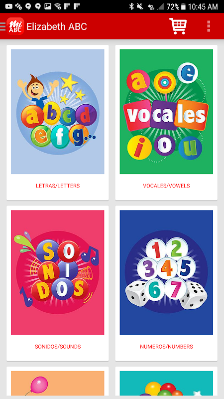 Mi ABCD presenta el alfabeto, vocales, colores, números, palabras, sonidos, familia y completar. Completar es un modulo de juegos.