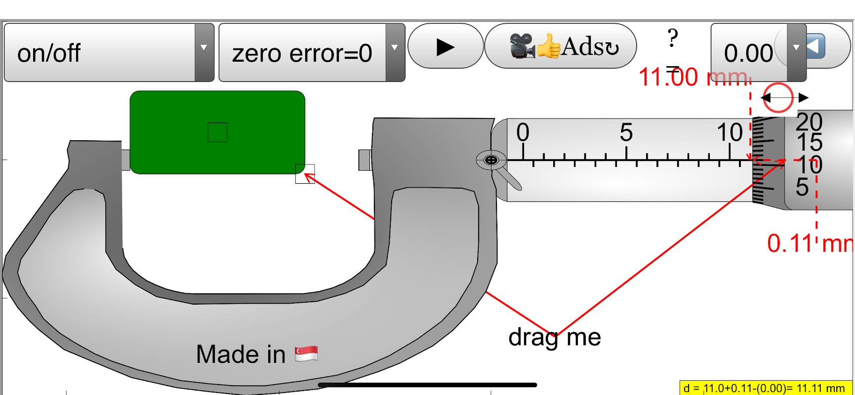 Этот апплет имеет объект (черный) с ползунком слева вверху для управления y-движением объекта в наковальню и шпиндель (челюсти), графика также позволяет выполнять перетаскивание. с помощью ползунка в левом нижнем углу, чтобы контролировать размер х объекта в наковальню и шпиндель (челюсти). На левом нижнем ползунке находится контроль нулевой ошибки, который позволяет исследовать, имеет ли микрометр погрешность +0,15 мм (макс.) Или -0,15 мм (мин.).