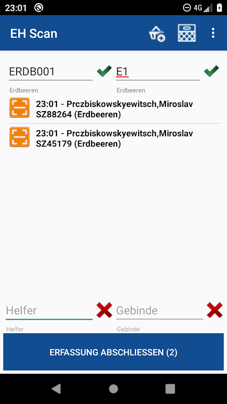 Надежная и быстрая запись была реализована таким образом, что помощник сначала сканировался или записывался по его идентификатору штрих-кода, а затем по контейнеру.