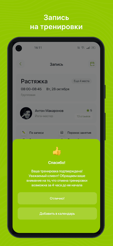 - Получать PUSH-уведомления о предстоящей тренировке за 3 часа;