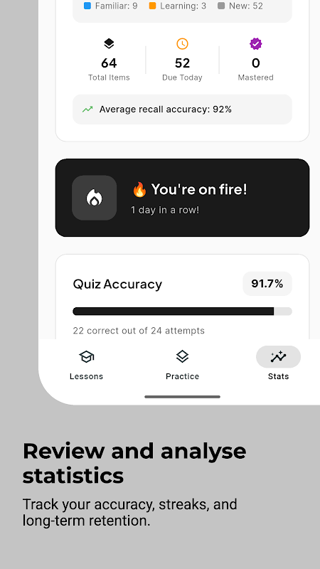 Наша система отслеживает, что вы знаете, а что забываете, помогая вам сосредоточиться на слабых местах для обеспечения долговременного запоминания.
