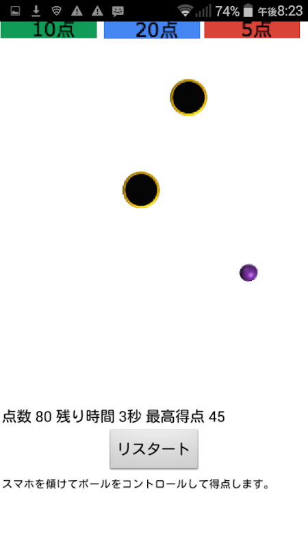 * 15秒間の間にスマホを傾けてボールをころがしてゴールにボールを入れて得点してください。