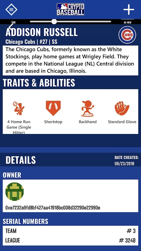 MLB Crypto Baseball Viewer is the best way to view your collection of Major League Baseball True Digital Collectibles. With this app you can view MLB Digital Figures straight from our MLB Crypto Baseball website (MlbCryptoBaseball.com) via a QR-Code or directly from scanning a promotional card that can be collected at select MLB stadium games.