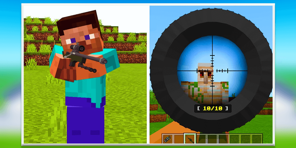 Оружие для майнкрафт имеет реалистичную физику, при этом не видно следов от пуль, но радиус действия пистолета очень большой. Предусмотрены точные удары по мобам. Особенно, если у вас есть снайпер.