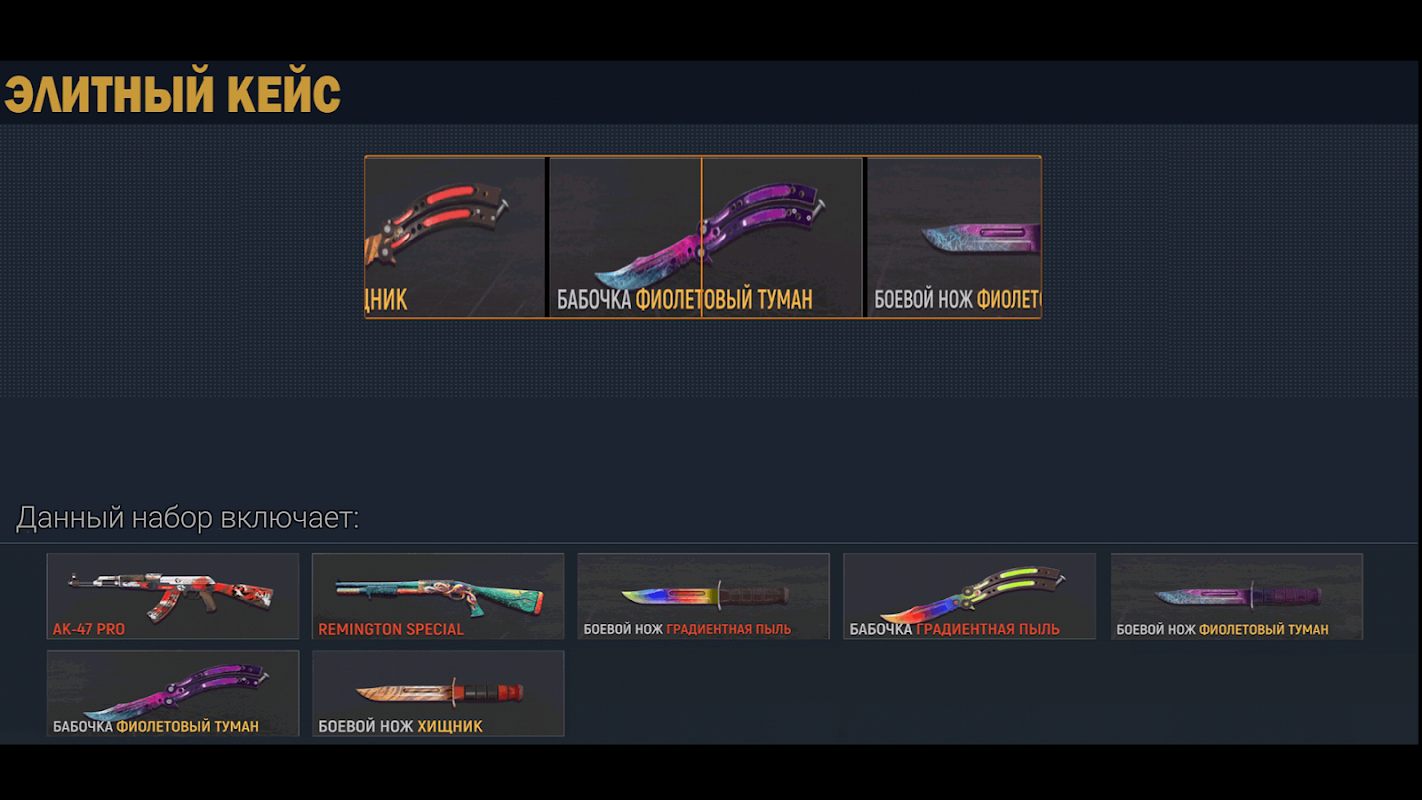 В игре вы можете открывать кейсы, покупать и продавать оружие, а также заключать контракты, обменивая старое оружие на новое.