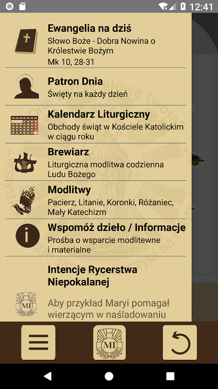 Aplikacja Modlitewnik MI – zawiera teksty modlitw dedykowanych dla Rycerstwa Niepokalanej – Stowarzyszenia założonego przez św. Maksymiliana Marię Kolbego w 1917 r. Zawiera komplet modlitw i rozważań wspomagających formację duchową Rycerstwa Niepokalanej. Ponadto, aplikacja zawiera, informacje o Patronie Dnia, intencjach miesięcznych MI a także kalendarz liturgiczny.