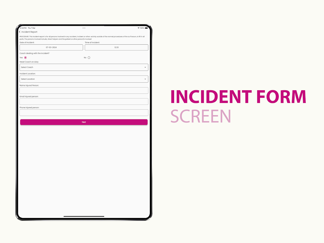 Форма сообщения о происшествии: в случае несчастного случая или несчастного случая во время сеанса серфинга Mojo Instructor предоставляет упрощенную систему сообщения об инцидентах. Инструкторы могут быстро документировать детали инцидента, включая характер инцидента, участвующих сторон, свидетелей и любые немедленные действия. принято. Приложение гарантирует, что отчеты об инцидентах будут оперативно переданы в соответствующие органы и руководство, что способствует своевременному реагированию и последующим процедурам для эффективного разрешения ситуации.
