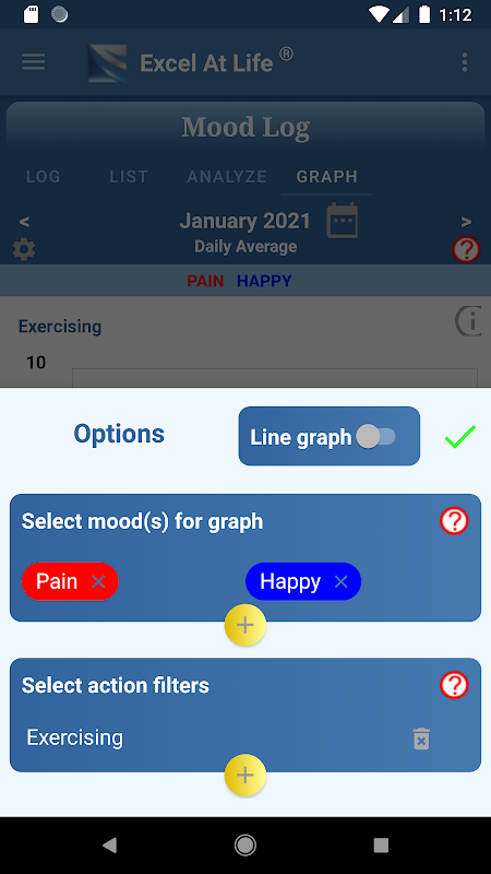 Чтобы сделать журнал настроений еще более эффективным, функция графика позволяет вам одновременно просматривать различные настроения и действия. Это позволяет анализировать закономерности на основе нескольких действий. Например, вы можете увидеть, как меняется ваше настроение, когда вы делаете что-то в одиночку или с кем-то.