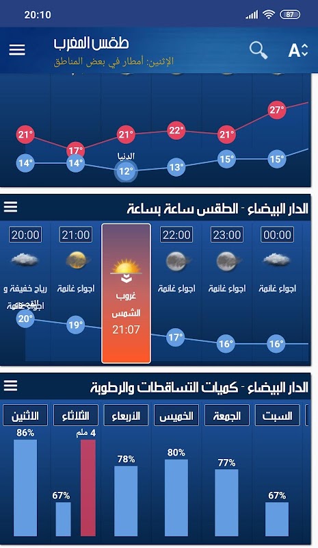 Получите прогноз погоды на следующие семь дней с помощью приложения Morocco Weather (погода, ветер и астрономическая влажность, а также предупреждения) для многих городов Марокко.