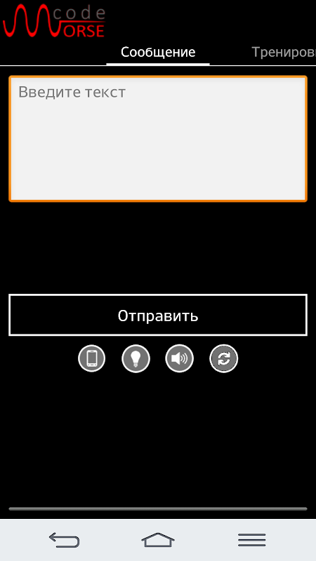 • Сообщение - это режим представленный на главном экране: можно ввести любое сообщение, которое после будет отображаться в виде последовательности азбуки Морзе через звук, вспышку или экран в зависимости от настроек в приложение