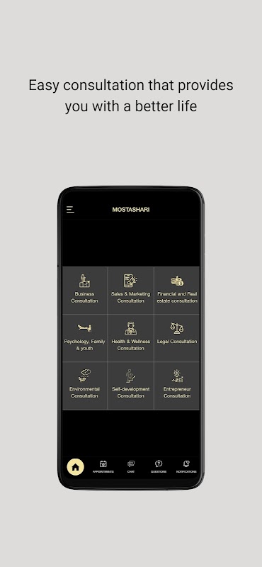 Приложение "Мосташари" охватывает многие области консультаций с помощью хорошо отобранных профессиональных консультантов, так как их консультации охватывают: