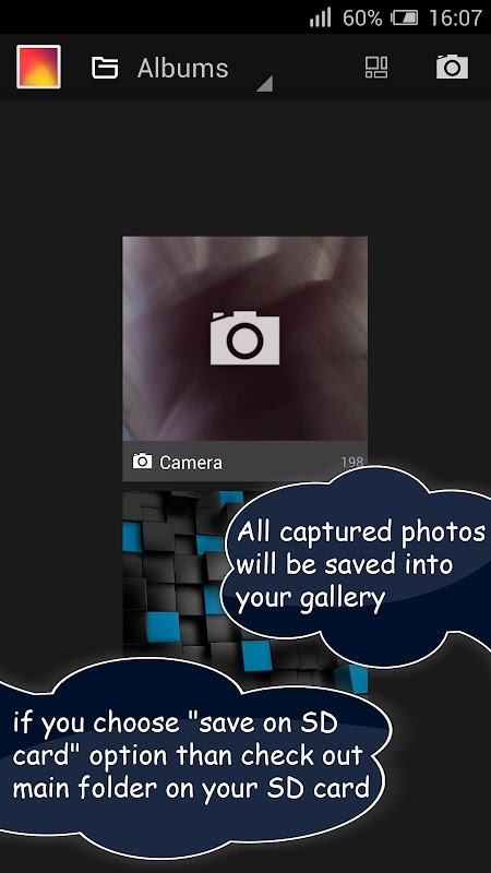 -Все сохраненные изображения будут сохранены в вашей галерее - в том же месте, где изображения будут сохранены при съемке фотографий с обычным приложением камеры (если вы не отметили опцию «сохранить на SD-карту»)