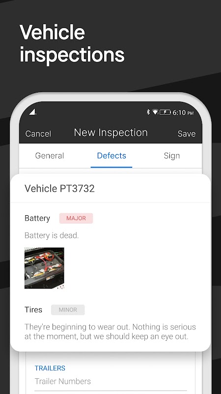 Заполняйте отчеты о предрейсовых и послерейсовых проверках транспортных средств водителем (DVIR), чтобы вы могли сообщать и отслеживать любые дефекты.
