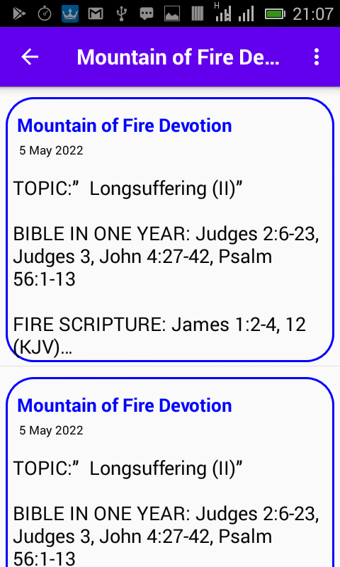 Ежедневное мобильное приложение Mountain Of Fire и Miracles Ministries Devotion - это инструмент, который обеспечивает простой способ чтения вашей ежедневной преданности на ходу, он предоставляет простой в использовании интерфейс, который организует чтения по календарным датам, что делает его