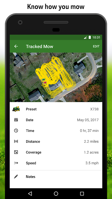 Отказ от ответственности: это приложение использует GPS для отслеживания скашивания, непрерывное использование значительно снизит уровень заряда батареи.