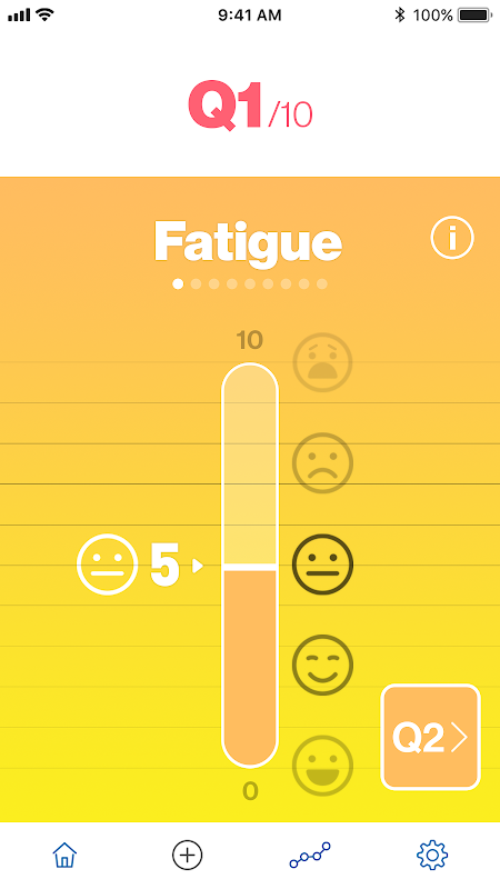 The app has been designed to allow for intuitive and quick input of the various symptoms of myeloproliferative neoplasm. Each day you can record the severity of ten symptoms on a scale of one to ten, with ten being the most severe.