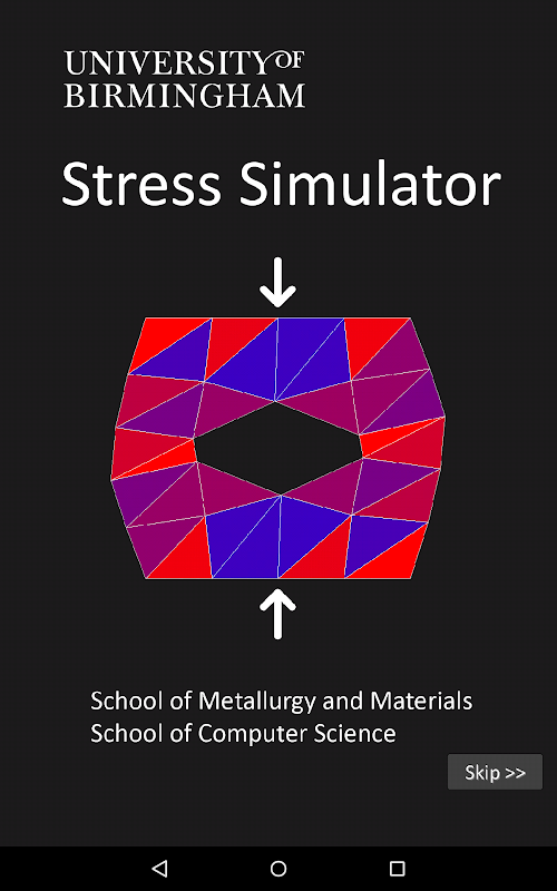 Сожмите оранжевые полосы на сжатие проверить материал, показанный на экране. Деформация и напряжение вычисляется распределение на лету и визуализируется. Материал параметры и геометрию испытательной части могут быть выбраны. Визуализация показывает один из нормальных или либо напряжений сдвига или критерия текучести Мизеса.
