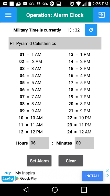 Operation: Alarm Clock is an application that will condition you for the military and hospital settings as far as the 24 hour format. In these two careers, you must know military time in order to be on time or give medication on time. You may come across a few folks in these careers that uses civilian time format, but you will come those who prefer military time format. So, it helps to be fluent in both civilian time which 12 hour format and military time which is the 24 hour format.
