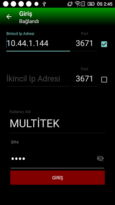 • Соединение: после установки значений «Основной IP», «Вторичный IP» и «Порт» в приложении вы можете подключиться со своего телефона, используя имя пользователя и пароль, указанные вами на планшете.