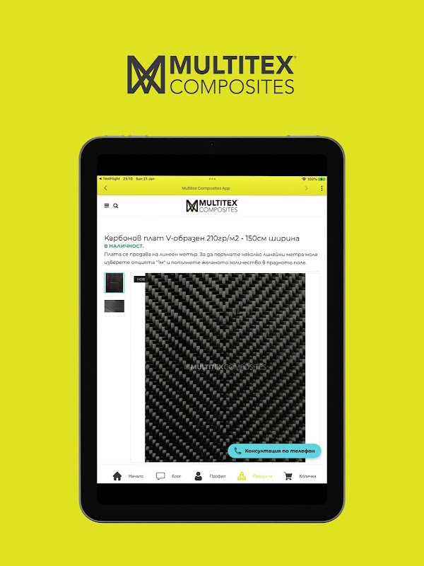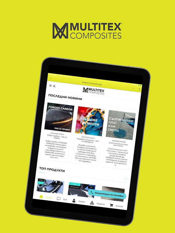 В приложении MULTITEX.bg для композитных материалов вы найдете первоклассную продукцию ведущих европейских производителей и обучающие материалы. С развитием технологий делать покупки стало еще проще, не выходя из дома или мастерской. Мы предлагаем широкий ассортимент углеродных, стекловолоконных, эпоксидных и полиэфирных смол, расходных материалов для вакуума и всех видов композитных материалов.