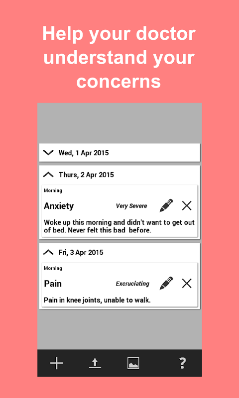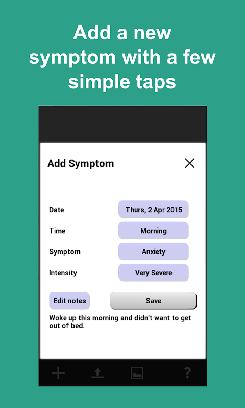 Ве не только сможете записать Вашы симптомы, но и добавить подробные детали, описание и дать им оценку. Затем, Вы можете послать дневник или список по электронной почте, или анализировать графу отдельного симптома. Процесс в краце: