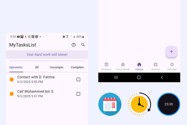 Приложение для управления задачами, планирования и повышения производительности. Поддерживает арабский и английский языки.