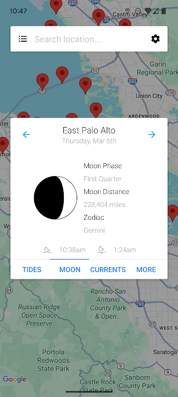 - Найдите ближайшие к вам места, когда приложение откроется, чтобы вы могли узнать время прилива, где бы вы ни находились!