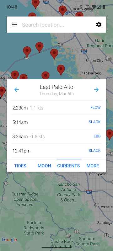 - Смотрите прогнозы течений (слабые, приливы и отливы на каждый день) в выбранных местах по всей территории США! Просто попробуйте просмотреть время приливов, как обычно, если поблизости есть станция течения, вы увидите дополнительную вкладку для «Течения».