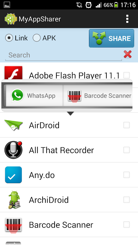 MyAppSharer также поддерживают акцию несколько приложений в одно время, и поддерживать мгновенный поиск, легко найти ваши приложения.