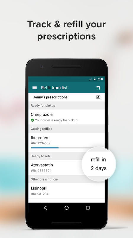 Просмотрите все свои рецепты в списке вместе с номером рецепта, дозировкой, количеством, заполнением слева и истечением срока действия. Вы также можете быстро отсканировать ярлык в своей бутылке с рецептом, чтобы заказать пополнение сразу.