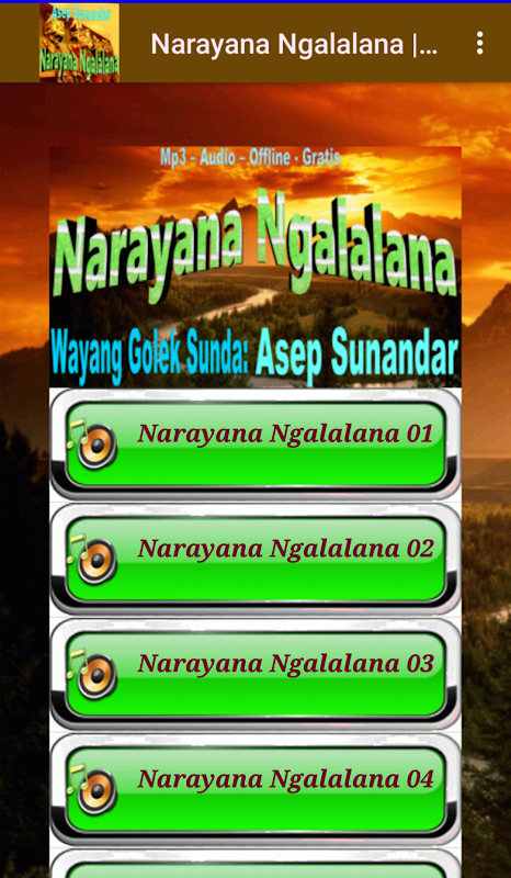 Наслаждайтесь лучшей коллекцией сунданского ваянга голека в пьесе под названием Нараяна Нгалалана (Принц Нараяна Берпетуаланг) в исполнении Ки Даланг Асеп Сунандар Сунария. Нараяна Нгалалана - это кукольный рассказ о приключениях принца Нараяны, который является воплощением Господа Вишну. Наслаждайтесь захватывающей и веселой историей о приключении принца Нараяны, чтобы вернуться к власти в королевстве Мандура. Наслаждайтесь игрой ваянг-голеков, которая полна жизненных советов, но также интересна из-за шуток Судана (Bobodoran). Наслаждайтесь высококачественными историями Ваянг Голека из знаменитой семьи Западная Ява Даланг, Сунария.