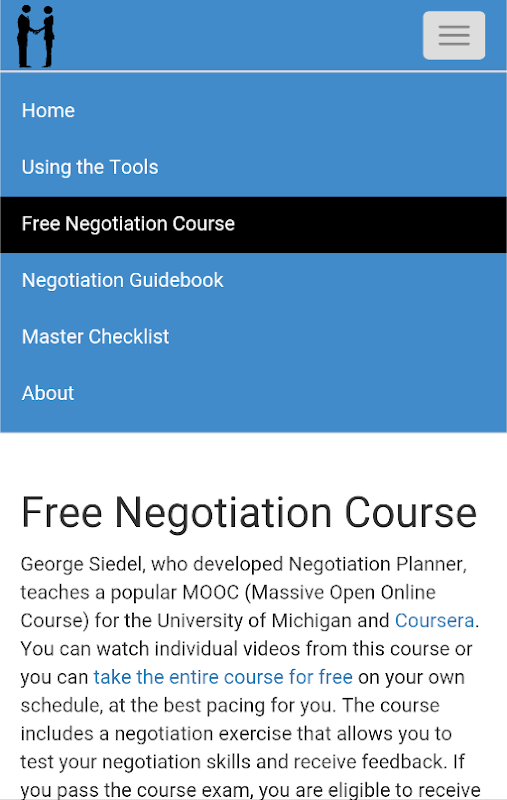 Negotiation Planner includes links to free videos from an online course offered by the University of Michigan and Coursera, “Successful Negotiation: Essential Strategies and Skills.” The course is taught by George Siedel, the award-winning professor at the University of Michigan who developed Negotiation Planner. Over 59,000 learners from 198 countries joined the first offering of the course. They ranged from CEOs to inexperienced negotiators. The course includes a negotiation exercise that allows you to test your skills and obtain feedback. Here are some learner comments about the free videos: