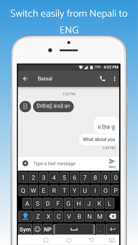 Nepali keyboard containing Nepali alphabets and symbols for Nepali keyboard typing. User can switch from Nepali language to English and English language to Nepali with a single tap.