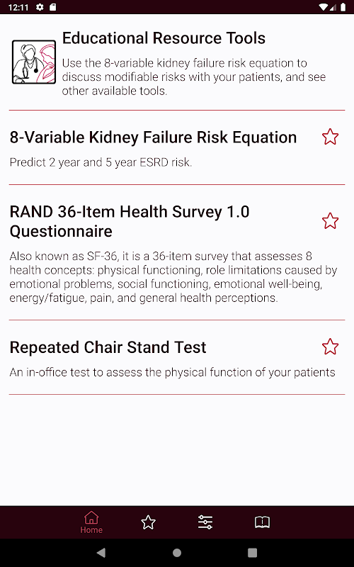 Neph + содержит инструменты образовательных ресурсов, руководства по управлению и калькуляторы уравнений нефрологии. В число последних обновлений приложения входят инструментальные средства, помогающие оценить физическое функционирование ваших пациентов, в том числе обследование качества жизни RAND-36 и повторный стендовый тест на стул, а также выдержки из Руководства по клинической практике KDOQI по адекватности гемодиализа (обновление 2015 г.).
