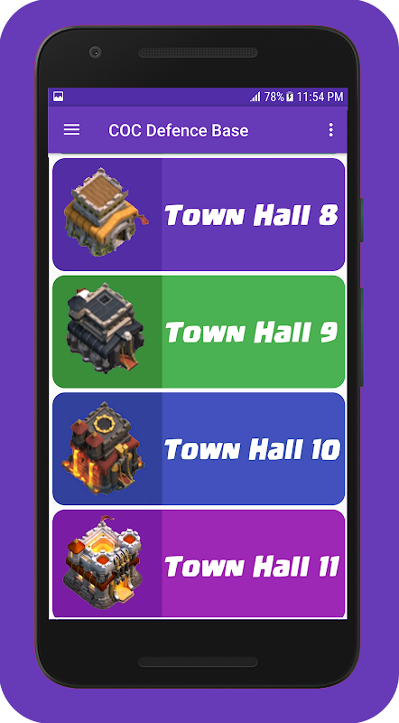 This is an Offline app that contains New Defensive Base Maps of COC village layouts from Town Hall 1 to Town Hall 11 with 4 category War, Trophy, Hybrid and Farming.