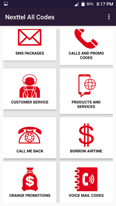 The application has all Nexttell USSD Codes in the following categories; Airtime Codes, Internet Option Codes, Calls and Promo Codes, Prepaid Packages and Tarrifs, Nexttel Customer Service Codes, Nexttel Mobile Money Codes, Products and Services, Call Me Back Codes, Voice Mail Codes, and Nexttel Prolongation Codes.