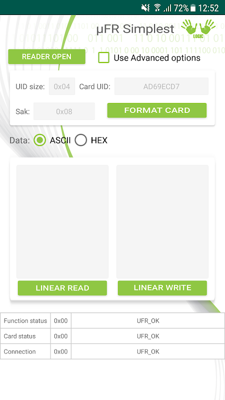Приложение требует внешнего считывателя NFC серии µFR: https://www.d-logic.net/nfc-rfid-reader-sdk/