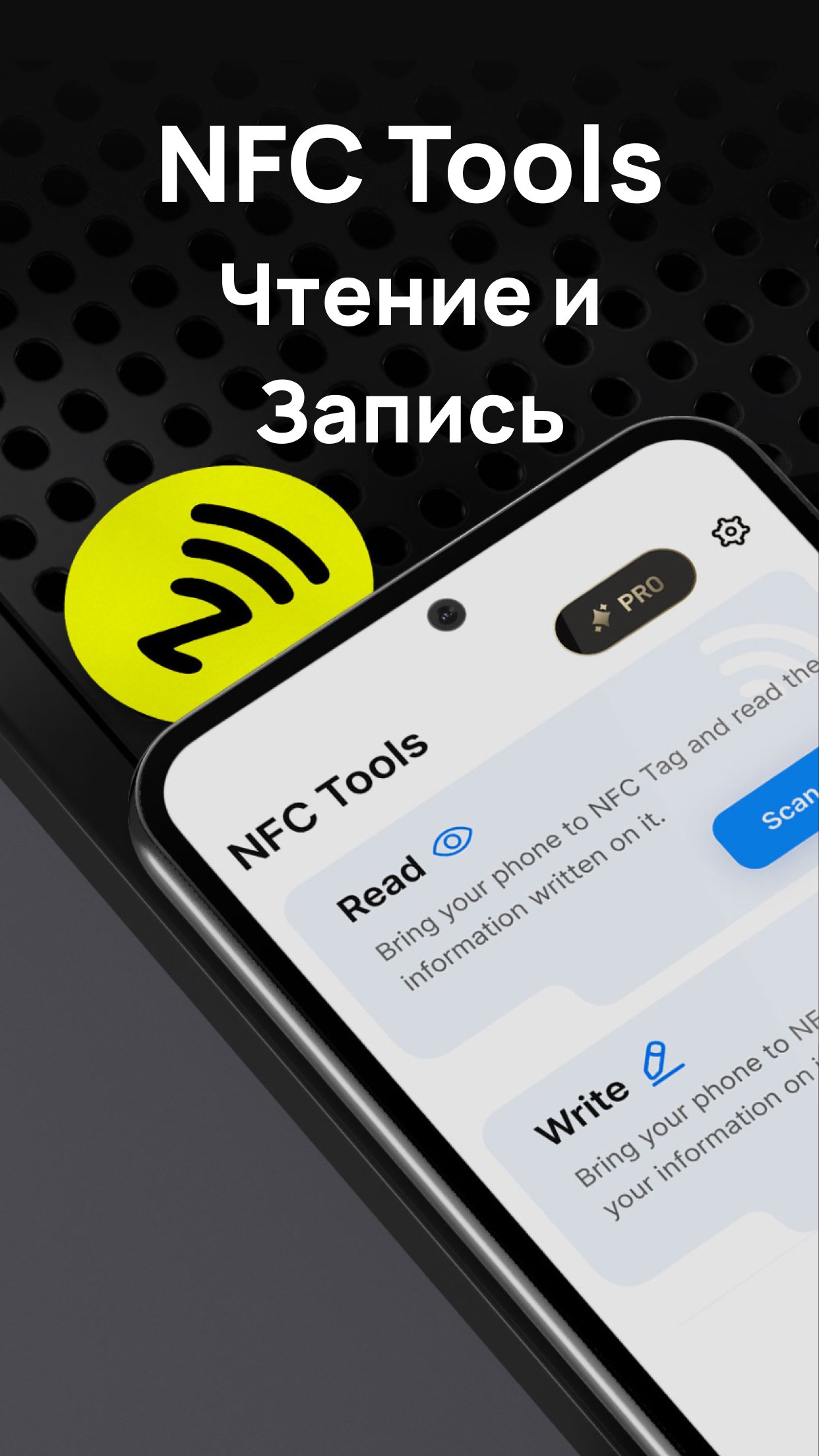 Мгновенно читайте, записывайте и сканируйте NFC-метки одним касанием. Телефон становится мощным NFC-считывателем и NFC-писателем.