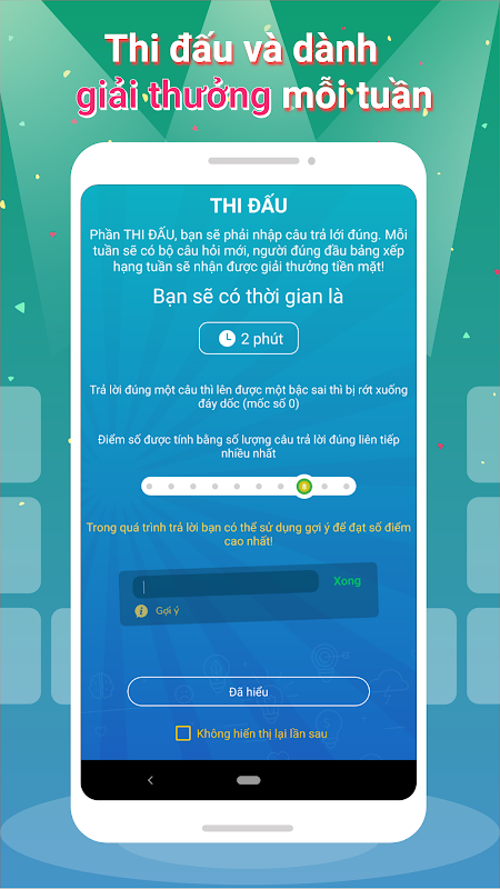 ⚡ Thi đấu hàng tuần ⚡Mỗi tuần sẽ có bộ câu hỏi mới, người chơi sẽ phải tự suy nghĩ và điền đáp án đúng. Sẽ có 2 phút để hoàn thành bộ câu hỏi, điểm số được tính là số câu trả lời đúng liên tiếp. Người chơi đứng đầu mỗi tuần sẽ nhận được giải thưởng tiền mặt.