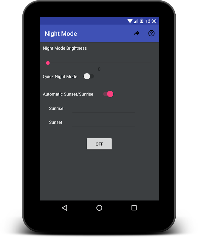 Это приложение поможет вам настроить ночной режим. Вам больше не придется беспокоиться, чтобы переключиться в ночной режим. Ночной режим (автоматический) сделает это за вас, тихо, но очень эффективно.