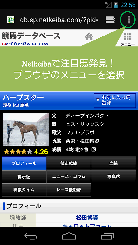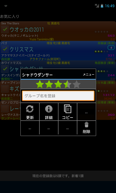 登録した馬は詳細情報が保存されます。詳細情報へはリストをフリックしたり、長押しメニューからのダイアログを開くことで行けます。詳細情報では直近三走や成績、血統等が保存され確認できるので、ブラウザの起動時間でイライラすることもありません。