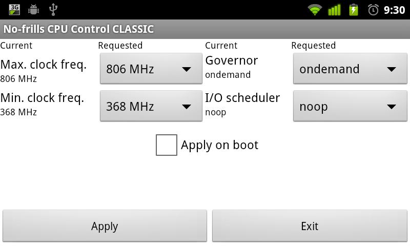 No-frills CPU Control CLASSIC is a trimmed down version of the popular No-frills CPU Control. It is meant for older devices running Android 1.6 "Donut" or Android 2.0 "Eclair" or for people who want an app as small as possible: just around 400KB!