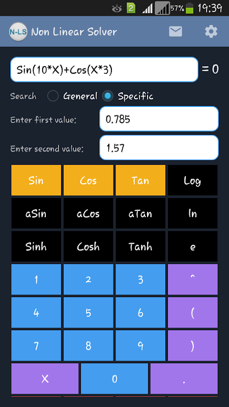 Научно инструмент / решатель для решения одной переменной нелинейные уравнения (NLS). Приложение можно вычислить несколько корни NLS. Приложение имеет два различных варианта для вычисления корня NS именно. (А) общее (б) конкретные. Генеральный опция поиска дает корень NLS без заданных пользователем пределах (должны использоваться для нелинейного монтажа с одиночными корнями) опция поиска .Specific дает корень в пределах, установленных пользователем (должны использоваться для NLS с кратными корнями, чтобы найти несколько корней с различными ограничениями) .The результаты могут быть отправлены на любой адрес электронной почты ID с помощью "Отправить по электронной почте" вариант в главном menu.The приложение имеет очень богатую и дружественный пользовательский интерфейс (пользовательский интерфейс).